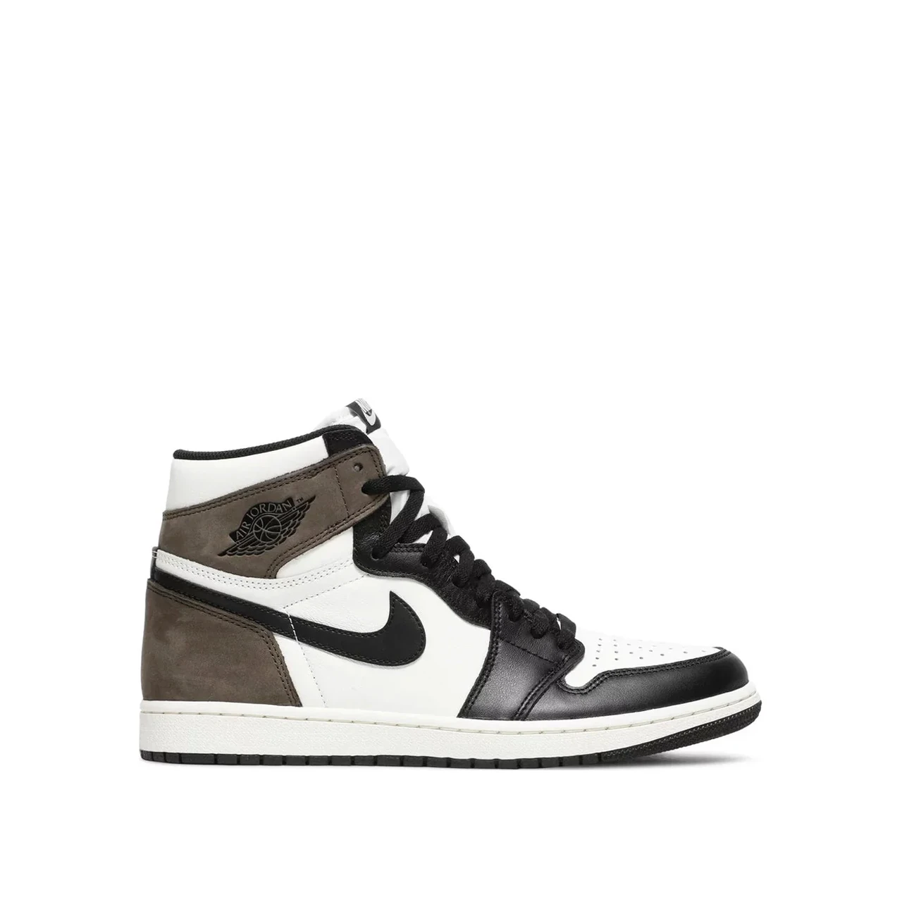Air Jordan 1 Retro High OG ‘Dark Mocha’ має характерну палітру, що нагадує співпрацю Травіса Скотта з Air Jordan 1, яка була дуже бажаною у 2019 році. Верх виготовлений з білої шкіри з контрастними чорними нашивками зі шкіри на зоні отворів для шнурків та на носку. Коричневий нубук використовується на накладці п'ятки та кришці відбірника, доповнений класичним логотипом Wings на бічній стороні. На нейлоновій мові розташований ярлик з брендом Nike Air.